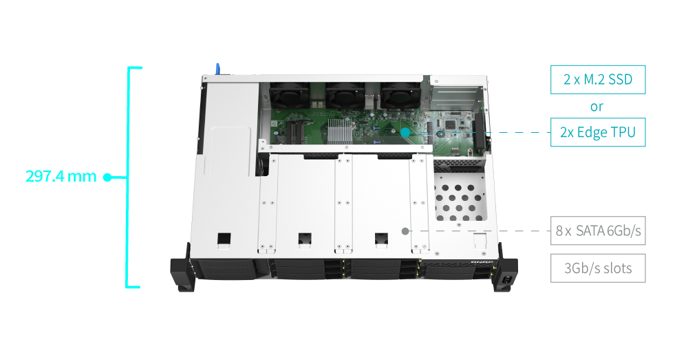 Storage: The unit features 8 drive bays for 3.5-inch SATA hard drives. It also has two M.2 PCIe Gen3 slots for installing NVMe SSDs, which can be used for cache acceleration or efficient tiered storage.